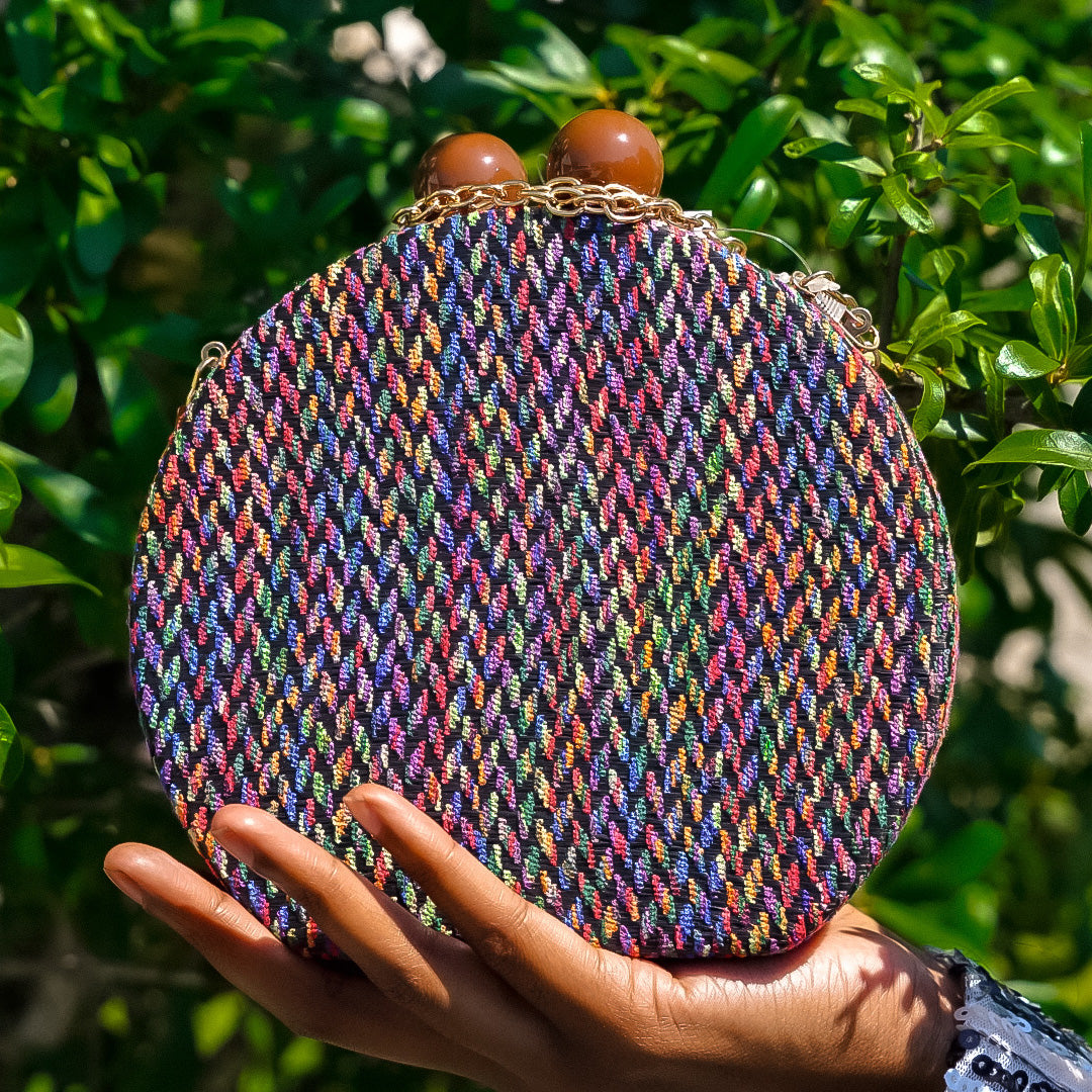 This stylish, multicolored woven Round clutch purse is the perfect accessory for any formal occasion. Its compact, round design adds an elegant touch to any look and is perfect for keeping your belongings safe and secure.